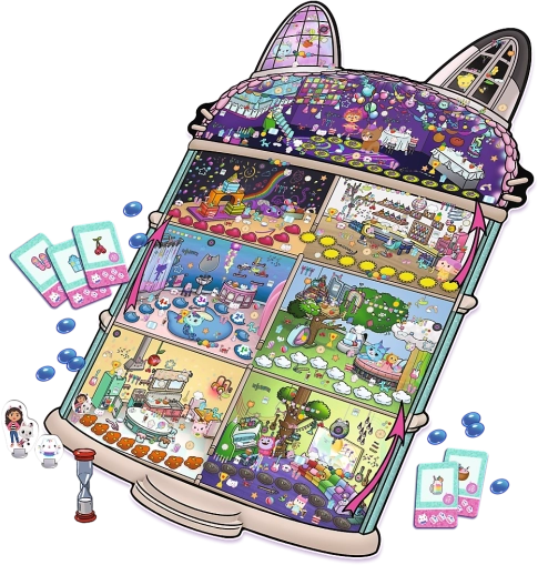 - Stor illustreret spilleplade i form af Gabbys Kattehus.