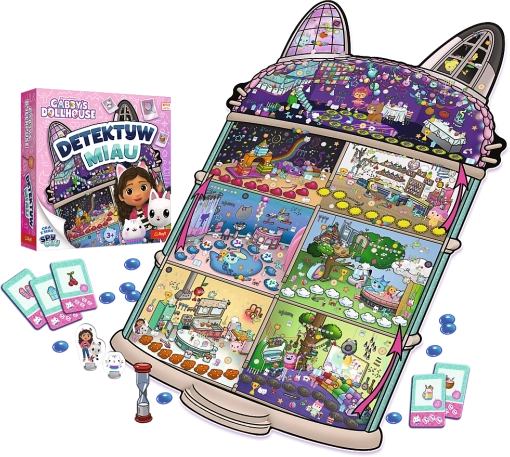 Tag på sporet sammen med heltene fra Gabbys Kattehus i det familievenlige, kooperative spil Detektiv Mňau fra TREFL. Slå jer sammen, træn opmærksomhed og samarbejde mellem spillere, find spor på den store plan i form af et dukkehus, og fang den fristede kat, før den når drys-festen uden den vigtige ingrediens.