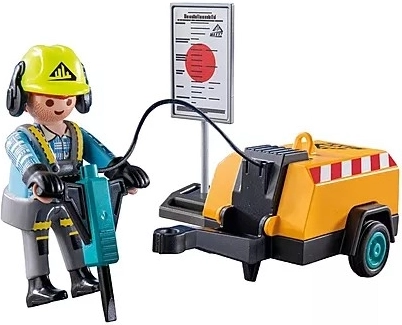 Hvad er det for en larm? Der arbejdes på byggepladsen! Bygningsarbejderen fra PLAYMOBIL ACTION HEROES er klar til krævende vejarbejde. Med den aftagelige hjelm og handsker er han klar til enhver udfordring, mens den kraftige tryklufthammer forbundet til kompressoren klarer selv hårde overflader.