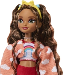 Langt bølget brunt hår med hårbånd og sløjfe, crop top med regnbue, cardigan med skyer og rød nederdel – alt let at kombinere og tage af.