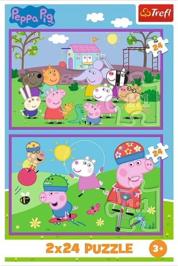 Sættet med puslespil 2x24 er fantastisk underholdning for børn, indeholder to puslespil med 24 brikker med motiv af den populære figur Peppa Pig, ideelt til fælles leg.