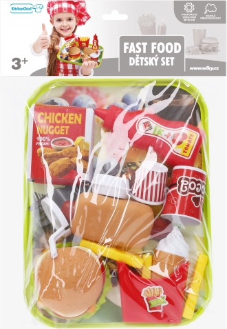 Sæt Fast Food med bakke tilbyder sjov leg med fastfood-servering. Indeholder forskellige slags madvarer og bestik til små kokke.