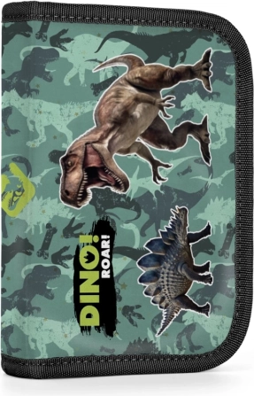 Sættet indeholder en gymnastikpose i slidstærk polyester med snørelukning og et enkeltlags penalhus med to flapper og 25 elastikholdere – alt i Dino Roar-motiv.