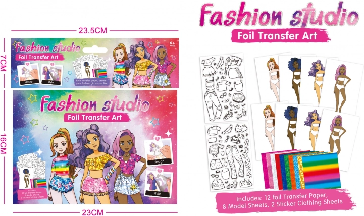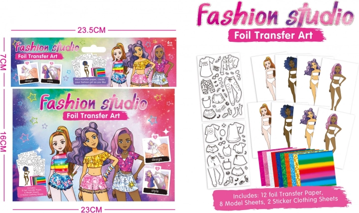 Opdag din kreativitet med en designerportefølje, der indeholder 8 modeller, 2 ark med tøjskabeloner og 12 farvede klæbefolier.