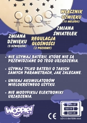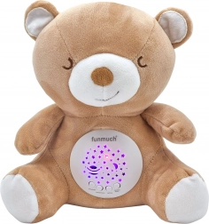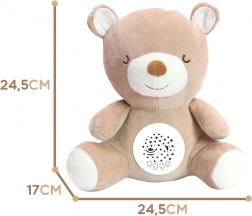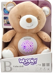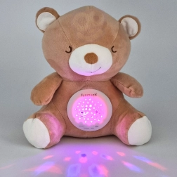 Bjørnen er lavet af blødt, behageligt materiale og fyldt med vat for maksimal blødhed. Takket være den aftagelige mekanisme kan plysen nemt vaskes, og barnet kan også bruge den som en klassisk krammelegetøj. 3 lydstyrkeniveauer gør det muligt at tilpasse lyden præcist til dit barns behov.