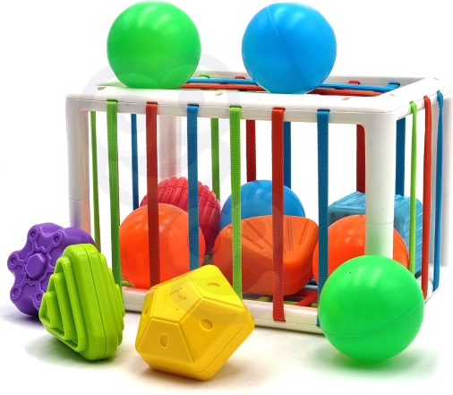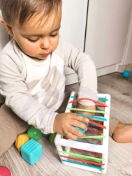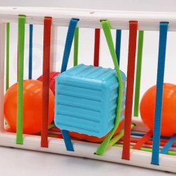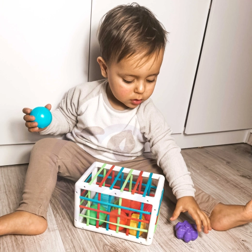Kuben kan også bruges til læring af farver og former i en senere alder. De elastiske, farvede bånd på kuben er behagelige for barnet og gør det lettere at lægge genstande i. Dette uundværlige produkt er ideelt til børn fra 12 måneder og hjælper med at udvikle finmotorik.