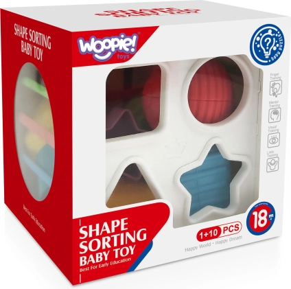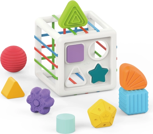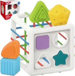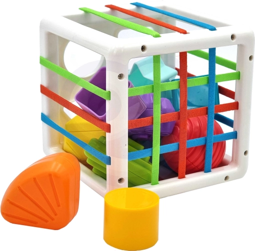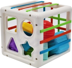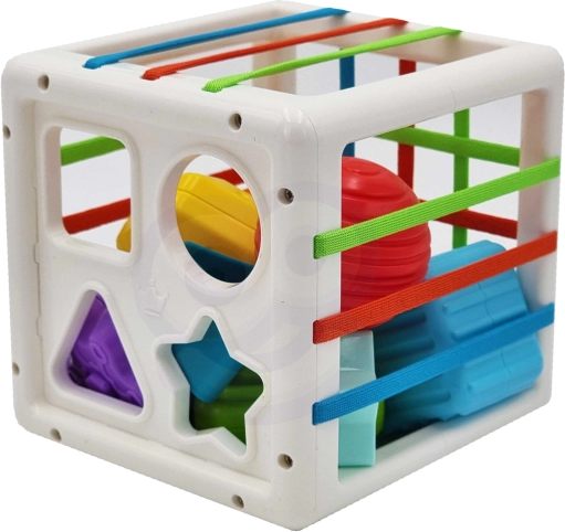 Denne farverige sensoriske terning kombinerer to populære aktiviteter: at lægge dele ind gennem elastiske bånd og sortere dem i formåbninger. Børn lærer at genkende farver og geometriske former, udvikler nysgerrighed og evnen til at koncentrere sig. De solide dele er lette at gribe, og terningen har en praktisk konstruktion til nem transport og oprydning.