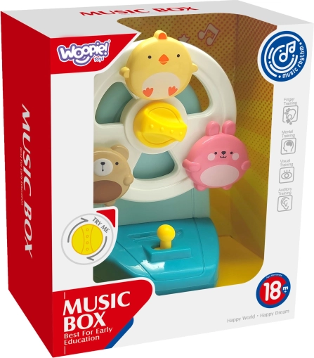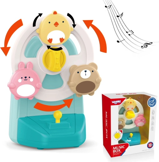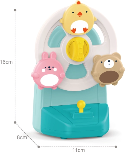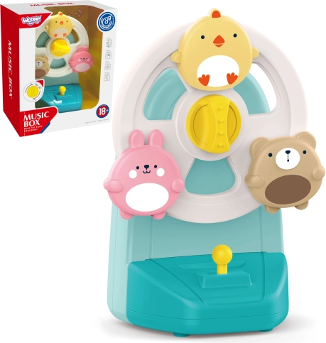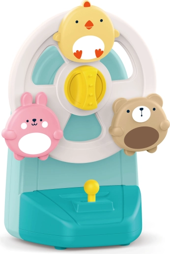 Oplev en interaktiv musikalsk karrusel med dyr, der både underholder og beroliger før sengetid. De farverige figurer af en kylling, en kanin og en bjørn begynder at dreje, når melodien spiller, hvilket naturligt understøtter udviklingen af syn, hørelse og hånd-øje-koordination. Den stabile sugekop holder legetøjet fast på glatte overflader, så det er sikkert og altid lige ved hånden.