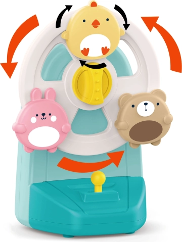 Barnet aktiverer nemt den roterende mekanisme med den gule drejeknap, observerer dyrenes bevægelser og træner finmotorik samt hånd-øje-koordination.