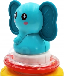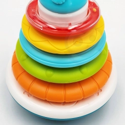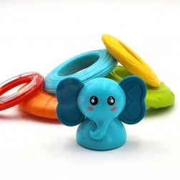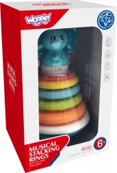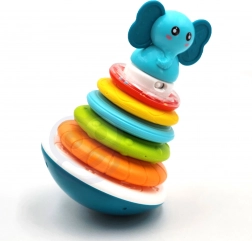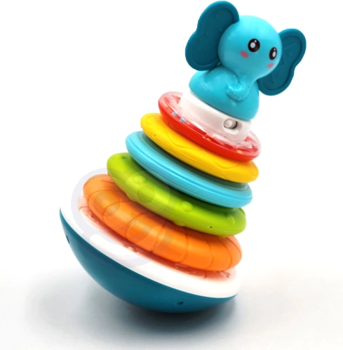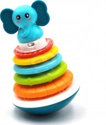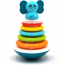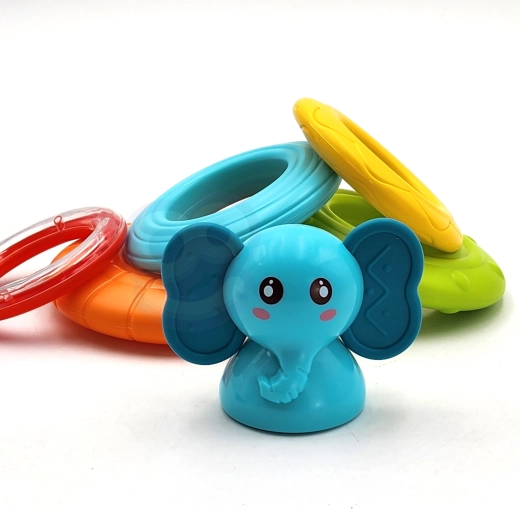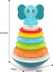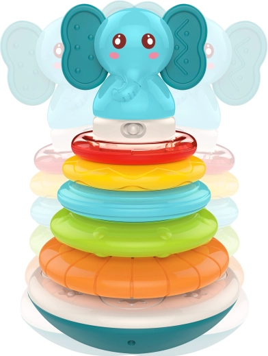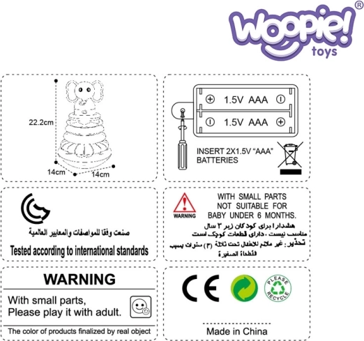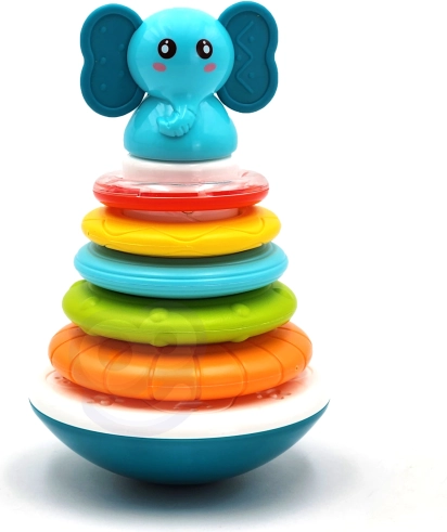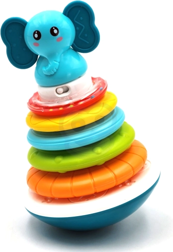 Det interaktive Elefant-tårn fra Woopie er bygget på en stabil base, der vipper ved berøring som en klassisk tumling, men det er svært at vælte. Legetøjet frigiver ranglende lyde ved berøring og udsender lys og glade melodier. En del af legen er at stable ringene fra den største til den mindste, hvorved sjove lyde aktiveres. Ved at trykke på elefanten afspilles forskellige melodier og lyde, som opmuntrer børn til at lege.