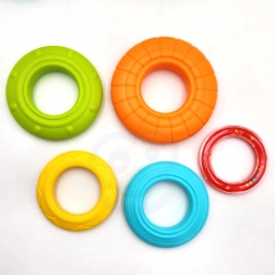 Ringe i forskellige farver og diametre, sammen med en rangle og melodiske lyde, stimulerer børns sanser og motoriske færdigheder.