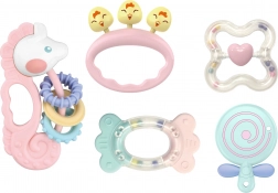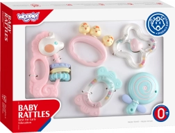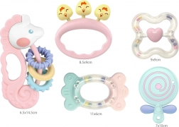 Et praktisk sæt med 5 farverige bideringe og rangler fra WOOPIE, som giver børn lindring ved tandfrembrud og samtidig understøtter sensorisk udvikling. Takket være forskellige teksturer, konvekse og konkave former samt legetøjets blide lyde udvikles syn, hørelse og følesans. Produkterne er lavet af sikre, ikke‑giftige materialer – et ideelt valg til daglig leg og beroligelse af gummerne.