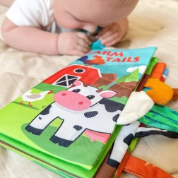 Bløde, udstikkende haler og knitreelementer indbyder til udforskning, stimulerer både berørings- og høresansen og motiverer barnet til at gribe og bladre.