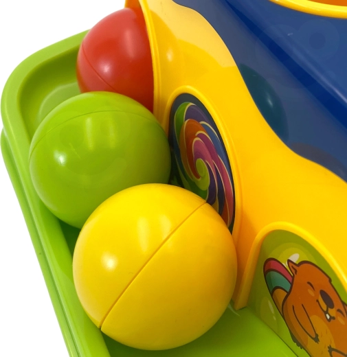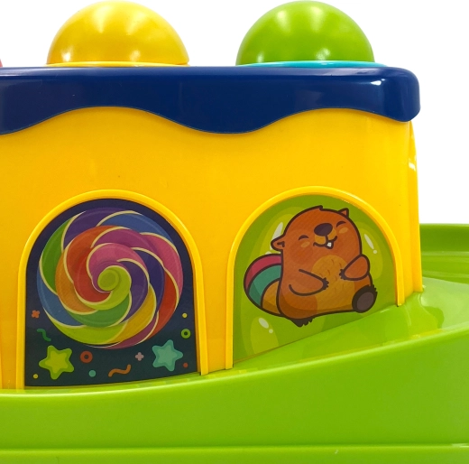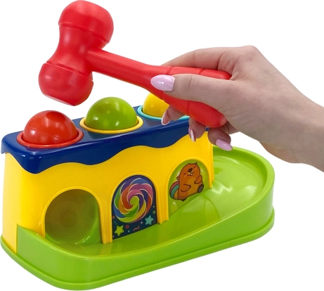 Med hammeren slår barnet på kuglerne, som glider ned ad banen. Barnet kan følge dem, mens de ruller, hvilket giver masser af sjov.