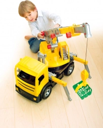 For stabil håndtering er der 4 udtrækkelige sidestøtter og kiler til at sikre hjulene mod bevægelse. Kranens bom drejer 270° og når ved udtræk en samlet længde på op til 115 cm. Den robuste plastkonstruktion er ideel både på børneværelset og i haven.