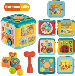 Hver aktivitet er omhyggeligt designet til at støtte forskellige færdigheder som hånd-øje-koordination, genkendelse af former og farver, udvikling af hørelse samt udtryk for kreativitet. Takket være de kompakte mål er kuben let at tage med, men stadig fyldt med endeløs sjov for små opdagelsesrejsende, der vil lære gennem leg.