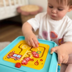 På en af siderne finder du et klaver, hvor barnet kan spille på tangenter, der udsender behagelige lyde. En anden attraktion er en hammerbænk, hvor børn bruger en hammer til at slå farvede bolde ind i kuben.