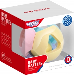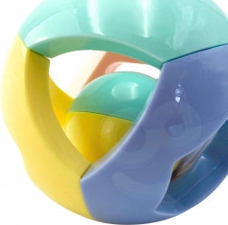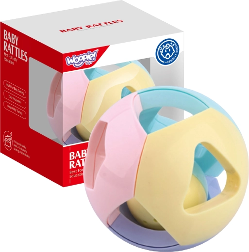 Den pastelfarvede WOOPIE-kugle begejstrer både babyer og forældre. Takket være den lette konstruktion med åbninger kan barnet nemt gribe, ryste og rulle den. De indvendige elementer bevæger sig ved rotation og skaber en blid raslen, der stimulerer hørelsen og motiverer til videre udforskning. De bløde gummigreb er skånsomme mod gummerne og fungerer som en bidering under tandfrembrud.