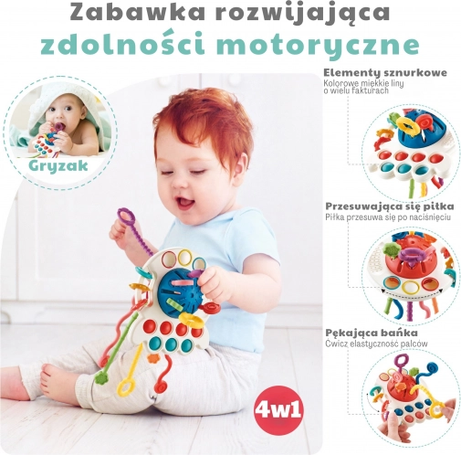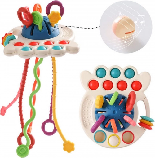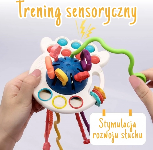 Opdag et multifunktionelt sansestimulerende legetøj og en bidering inspireret af Montessori-metoden, som understøtter sanseudvikling, finmotorik og giver lindring under tandfrembrud. Farverige træksnore med forskellige teksturer, drejeelementer og pop-bobler indbyder til at gribe, trække og udforske, mens sikre materialer og nem vedligeholdelse glæder forældre.