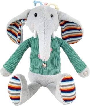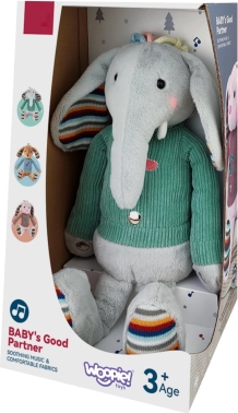 Den interaktive Woopie-plyselefant er udstyret med tre sensoriske zoner på fødderne og maven, der ved berøring afspiller musik. Dens lyserøde kinder lyser op og skaber en magisk atmosfære omkring legetøjet. Plyselefanten har en trøje på, under hvilken der er plads til 3 batterier. Denne bløde, berøringsaktiverede elefant bliver barnets ven i mange år.