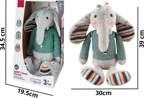 Den interaktive plyselefant fra mærket Woopie beroliger og vugger dit barn i søvn. Den er ikke kun en sød ledsager, blød og krammevenlig, men også en fantastisk makker til leg og underholdning.