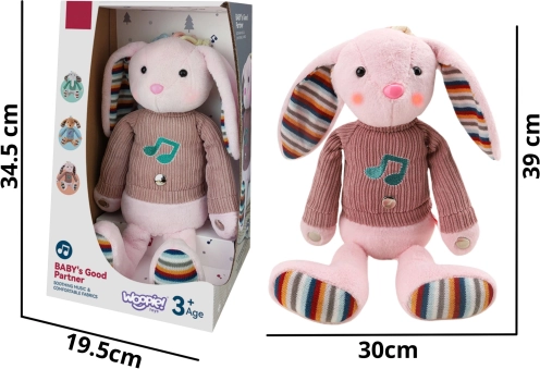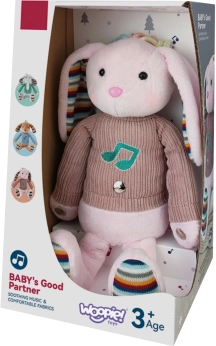 Den interaktive plyskanin Wooppy er udstyret med tre sensoriske zoner – på poterne og maven, som ved berøring afspiller musik. Dens lyserøde kinder er oplyste og skaber en eventyrlig atmosfære omkring legetøjet. Kaninen er klædt i en sweater, under hvilken der er plads til 3 batterier. Denne bløde ved berøring kanin bliver barnets ven i mange år.