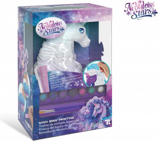 Nebulous Stars Ønskekasse. Sæt: Mal din egen ønskekasse. Indhold i pakken – ønskekasse, 7 akrylfarver, glitrende lak, 2 pensler, 75 sten, mini gelpen, mini dagbog, vejledning.