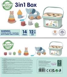 Oplev læringssættet 3‑i‑1 fra WOOPIE GREEN – en smart kombination af sorteringsboks, pyramide med bjørn og trækslon. Legetøjet er lavet af sikre materialer, har afrundede kanter og et praktisk låg med håndtag for nem transport. Perfekt til udvikling af fin- og grovmotorik, læring af former og farver samt koordination allerede fra 12 måneder.