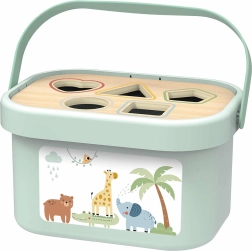 Låget med formeudskæringer lærer børn at sortere og genkende former og farver. Delene kan opbevares indeni efter leg, og boksen bæres nemt i det praktiske håndtag.