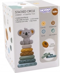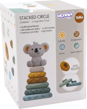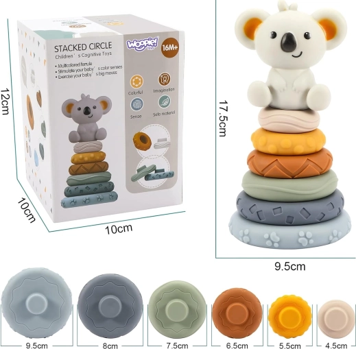 Børn kan stable efter fantasi eller efter ringstørrelse, hvorved de udvikler genkendelse af former og størrelser, koncentration og tålmodighed. De blide pastelfarver og den bløde koalafigur gør legetøjet til en attraktiv ledsager hver dag.