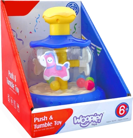 Udforsk verden gennem leg med det innovative legetøj "Sjov Karrusel"! Det er designet til de mindste opdagelsesrejsende og hjælper med at udvikle deres motoriske, sansemæssige og kognitive evner. Barnet skal blot trykke på den gule øverste del af karrusellen, så begynder hesten og kuglerne at bevæge sig.