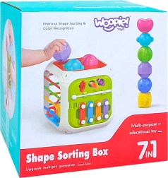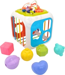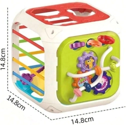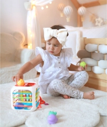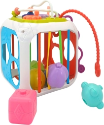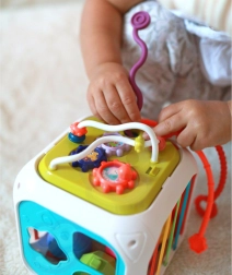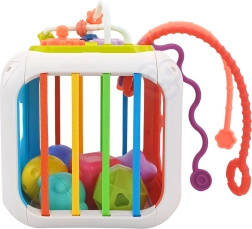 Kuben er fremstillet af kvalitets-ABS-plast og silikone og er holdbar og sikker for små hænder. Med følger også sorteringsklodser med skjulte rasleklokker, som motiverer til eksperimenter med lyd, former og farver. Den aftagelige topdel udvider lege-mulighederne – barnet kan bruge den separat på underlaget eller i barnevognen.