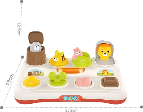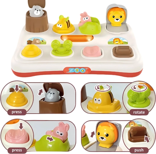 Oplev leg og læring i ét med det interaktive WOOPIE-legetøj – springende ZOO-dyr. Når du aktiverer det med en kontakt, drejeknap eller knapper, popper dyret op og overrasker barnet. Legetøjet er slidstærkt, veludført og støtter både finmotorik og forståelse af årsag‑virkning.
