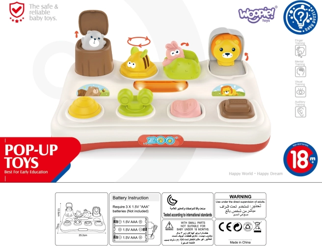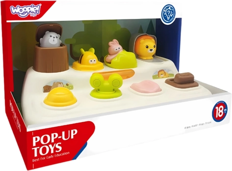 Det interaktive pop-up legetøj WOOPIE giver børn fra 18 måneder en sjov måde at lære på. Forskellige betjeningselementer – kontakt, drejehjul og knapper – udløser mekanismen, så dyrene popper op. Derved træner børn hånd‑øje‑koordination, udvikler sansefornemmelse og lærer, hvordan deres handling skaber en reaktion.