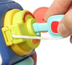 Venstre side af kuben har en pop-it, der laver lyd, når den drejes. Højre side afslører en hemmelighed, når man drejer den solidt fastgjorte nøgle i snoren.