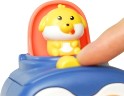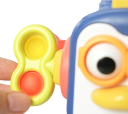 På pingvinens hoved er der en aksel med en pop-op hund, som springer op ved tryk og giver ekstra sjov og interaktivitet.