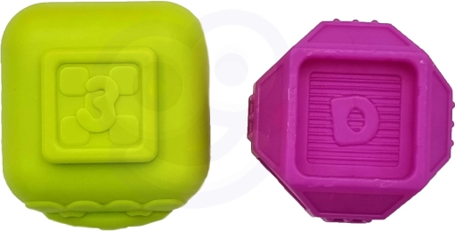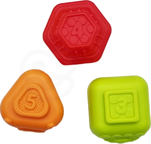 Sættet inkluderer 6 solide sensoriske klodser med forskellige former, strukturer og farver. Hver del har et tal, der gør sortering og de første tælleøvelser lettere. Blokkene kan samles til et tårn, og takket være de raslende elementer er de også sjove som rangler.