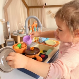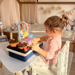 Vandhanen med funktionelt vandforsyning gør det muligt for børnene at lære og lege interaktivt som i et rigtigt køkken.