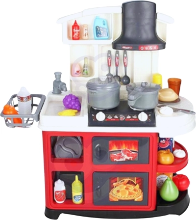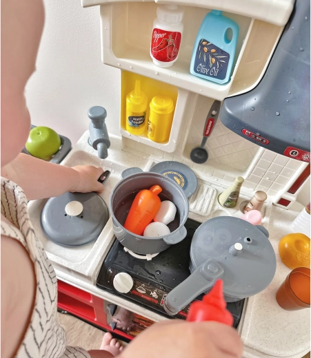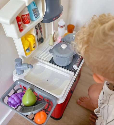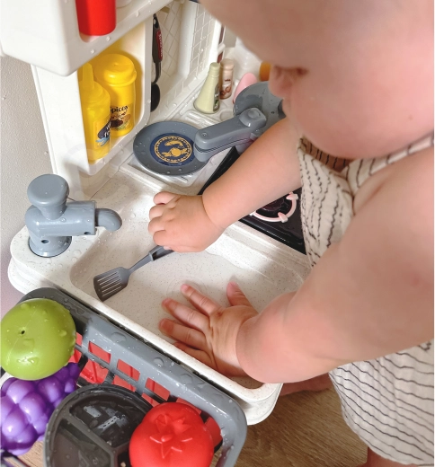 Takket være robust plastik er køkkenet holdbart og sikkert til daglig leg. Det rige tilbehørssæt omfatter madvarer, redskaber, gryder og pander, så børn kan afprøve alle trin i madlavningen – fra at vaske ingredienser til at servere.