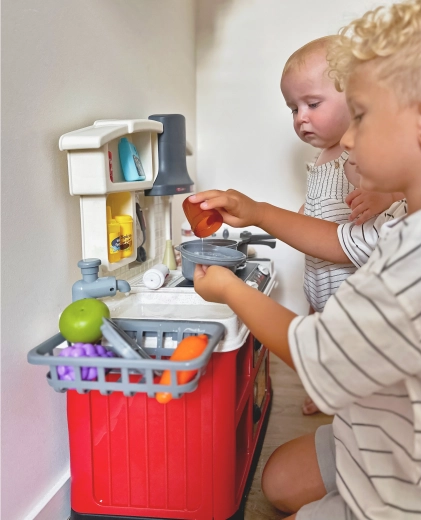 Børn kan skylle frugt og service takket være den fungerende hane med vandcirkulation – sikkert, sjovt og maksimal realistisk.
