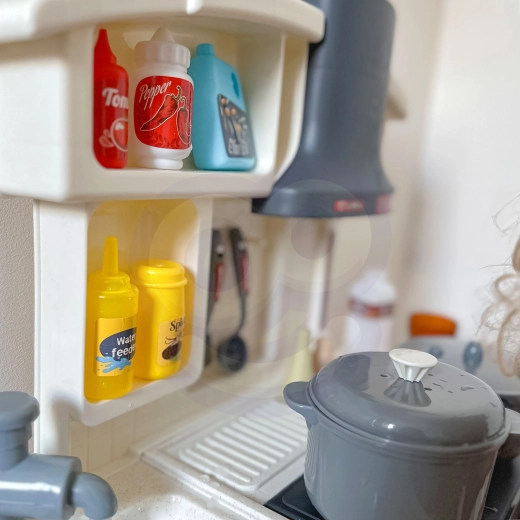 Dette store XL legekøkken fra WOOPIE tilbyder alt til mange timers leg: realistisk hane med rindende vand, effekt af kold damp på kogepladen, belyste brændere samt lyde af madlavning og stegning. Åbnelåger i ovn og skab, praktiske hylder og masser af tilbehør hjælper med at holde orden og stimulerer de små kokkes fantasi.