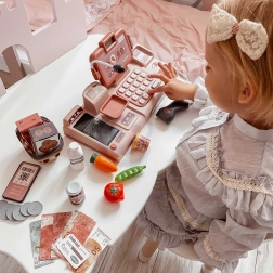 Dette stilfulde WOOPIE børnekasseapparat giver autentisk købmandsleg: børn vejer frugt og grønt, scanner produkter og slår indkøbet ind via et overskueligt tastatur. Takket være betalingsterminalen kan de prøve både kortbetaling og kontaktløs betaling, pengekassen åbnes med knappen OPEN, og mikrofonen fungerer som en rigtig.
