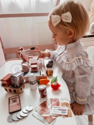 - Komplet sæt med 25 dele – kurv, frugt og grøntsager, kiks, vand, cola, is, betalingskort, sedler og mønter, telefon m.m.