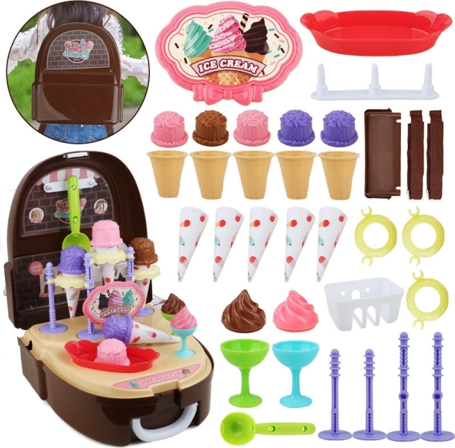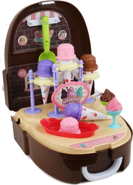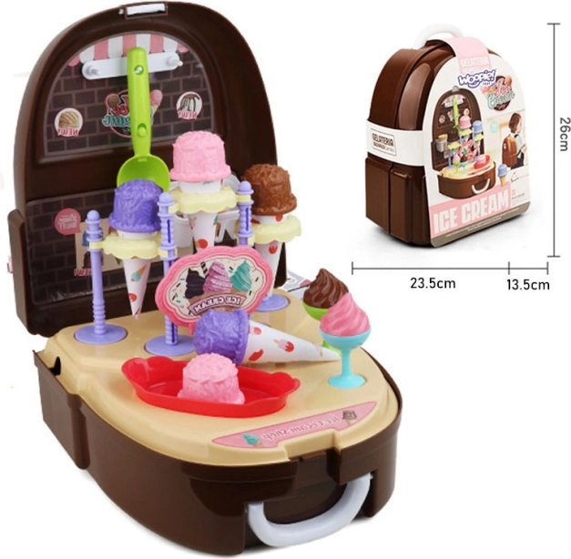 Lille konditor altid klar! Dette søde sæt i form af en rygsæk forvandles ved åbning til en komplet isbutik og en mini-butik. Børn kan servere kugleis, fylde vafler og sælge søde lækkerier til venner og forældre. Takket være den lette konstruktion kan de nemt tage det med på legepladsen, til bedstemor eller på ferie.