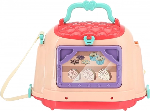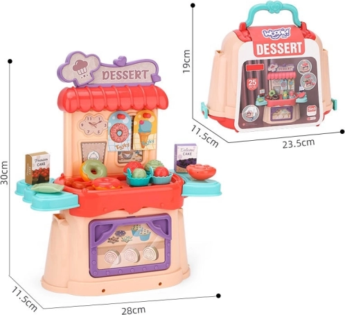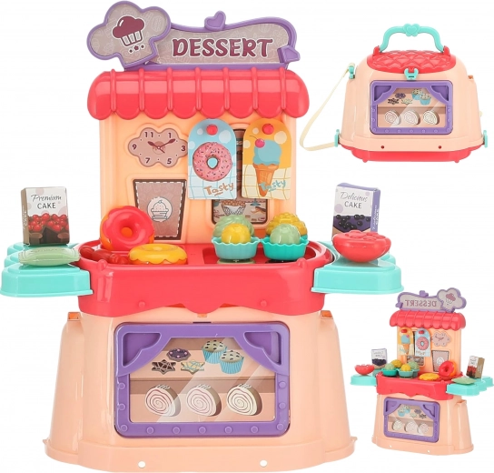 Dette farverige sæt bringer børn ind i en verden af søde sager – fra donuts og cupcakes til is – og byder samtidig på en praktisk konstruktion, der på få øjeblikke forvandles fra en kompakt kuffert til en fuldgyldig disk. Takket være skulderremmen kan børnene nemt bære sættet og åbne deres egen mini-konditori hvor som helst.