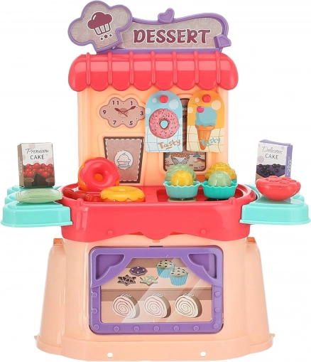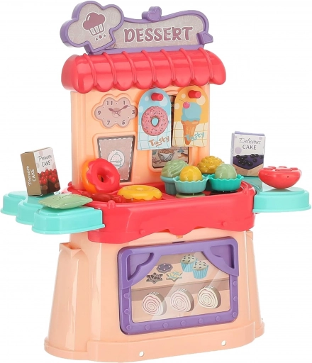Omfatter is, donuts, slik, skåle, æsker og andre tilbehør til realistisk leg som butik og konditori.