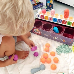 Legetøjet muliggør læring af tal og farver gennem stable- og sorteringsaktiviteter.