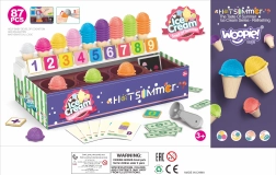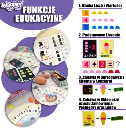 Isbod-legesættet fra Woopie byder ikke kun på sjov ved at lege is-sælger, men giver også læring i tal, farver og grundlæggende addition. Det indeholder 87 dele, herunder iskugler, vafler, bestillingskort, penge, jetoner med tal og en isske.
