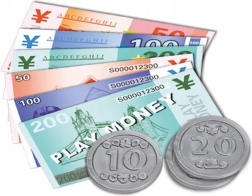 - Betalingskort, sedler, mønter, æske med kiks, hylde med artikler