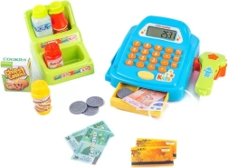 Sættet indeholder betalingskort, sedler, mønter, en æske med kiks og en hylde med artikler til fuldendt butiksleg.
